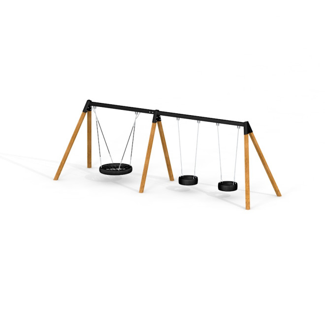 Deze schommel is perfect voor zowel publieke speeltuinen als privé-tuinen, waar het een centrale plek kan innemen in de buitenruimte. De combinatie van een vogelnestzitje en twee bandenzitjes maakt het mogelijk om samen te spelen, wat sociale interactie en motorische ontwikkeling stimuleert. Het tijdloze ontwerp past moeiteloos in diverse landschappen en draagt bij aan een uitnodigende speelomgeving.