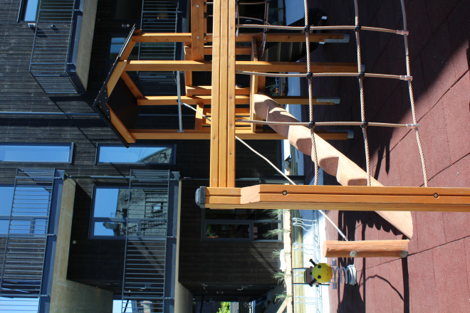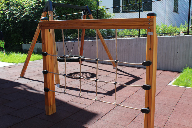 Dit speeltoestel is vervaardigd uit duurzaam larikshout, gecombineerd met versterkt PP-touw en PE-elementen, wat zorgt voor een robuuste en weerbestendige constructie die langdurig speelplezier garandeert.